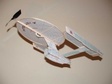This is a fantasy model of the Star Trek starship Enterprise as it appeared in the move "The Voyage Home". Since there is no real aircraft for this model it is not competition legal. It was developed simply to have fun with a very popular subject. The FAC competition rules allow a model's wing span to be 16". Since this model is not competition legal, and due to its shape the overall width (wing span does not seem to fit this application) is 12". It has an overall length of 17". It is a nice flyer and can use a plastic prop to help achieve the necessary center of gravity. The plan package is printed on multiple legal size (8 1/2" x 14") sheets of paper. The graphics are also provided in the package for printing on tissue.