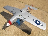 Park Scale Models. It has a 19.25" wing span. It is powered with a motor and gear drive from a Parkzone Micro Mustang. covering is ink jet printed tissue. Flying weight is 42 grams. Controls include rudder, elevator, and throttle. The kit is designed for the compact "brick" style AR6400 receivers from Specktrum. The equipment is mounted on a slide out tray. The push rods are connected via magnets.