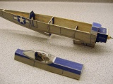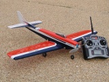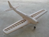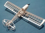 This model is a vintage design by Comet models. It is called the Phantom Fury and was first released in the 30's as a rubber powered Free Flight model. It has a 32" wing span giving a wing area of 90 square inches. Paul happened to have a kit for this model that was purchased in the '80's while Comet models was still in operation. He thought it might make a nice electric R/C conversion subject for "Slow flying" in the front yard. This model was built around 1998. As shown, the model weighs 103 grams (3.6 ounces). It is powered with an Astro Fire Fly motor geared 16:1. The battery pack is 6 50 mah cells. The receiver is a light weight (6 grams) Alpex, the electronic speed control is a JMP-7, and the two servos are unmodified Hitec HS-50's. Controls include throttle, rudder, and elevator. The model flies nicely, but does require careful application of rudder control to keep it from snapping in the turns. Covering is Japanese tissue that has been colored with an ink jet printer. There are two coats of thinned clear dope on the tissue.