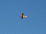 This is the Dave-E. It is double size version of a design by Bob Selman. It has a wing span of 40" with a flying weight of 32 ounces.The motor is an eFlite Park 450. The motor gets its power from a three cell 2100 mah lipo pack. Control functions include throttle, rudder, elevator, and ailerons. It can perform most non 3D aerobatics. Works well in the more limited size flying sites.