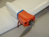Bob Selman. The model has proven to be a great small space flyer. The motor is an N-20/gear drive package from Bob Selman. turning a 5" Gunther prop of the type used on the Speed 400 powered Zagi. Energy is provided by two lithium polymer 190 mah cells in series. Flight duration is in the 15 to 20 minute range depending on wind conditions. The model will handle a fair amount of wind when flown outdoors.